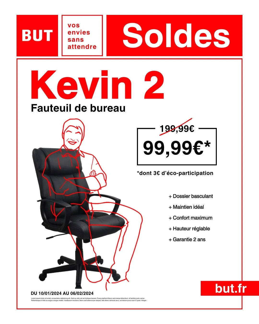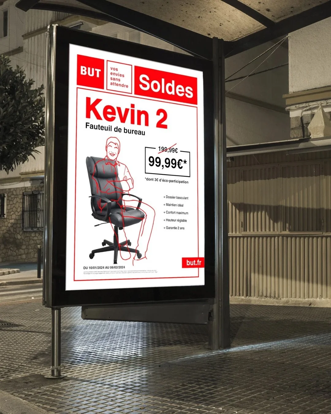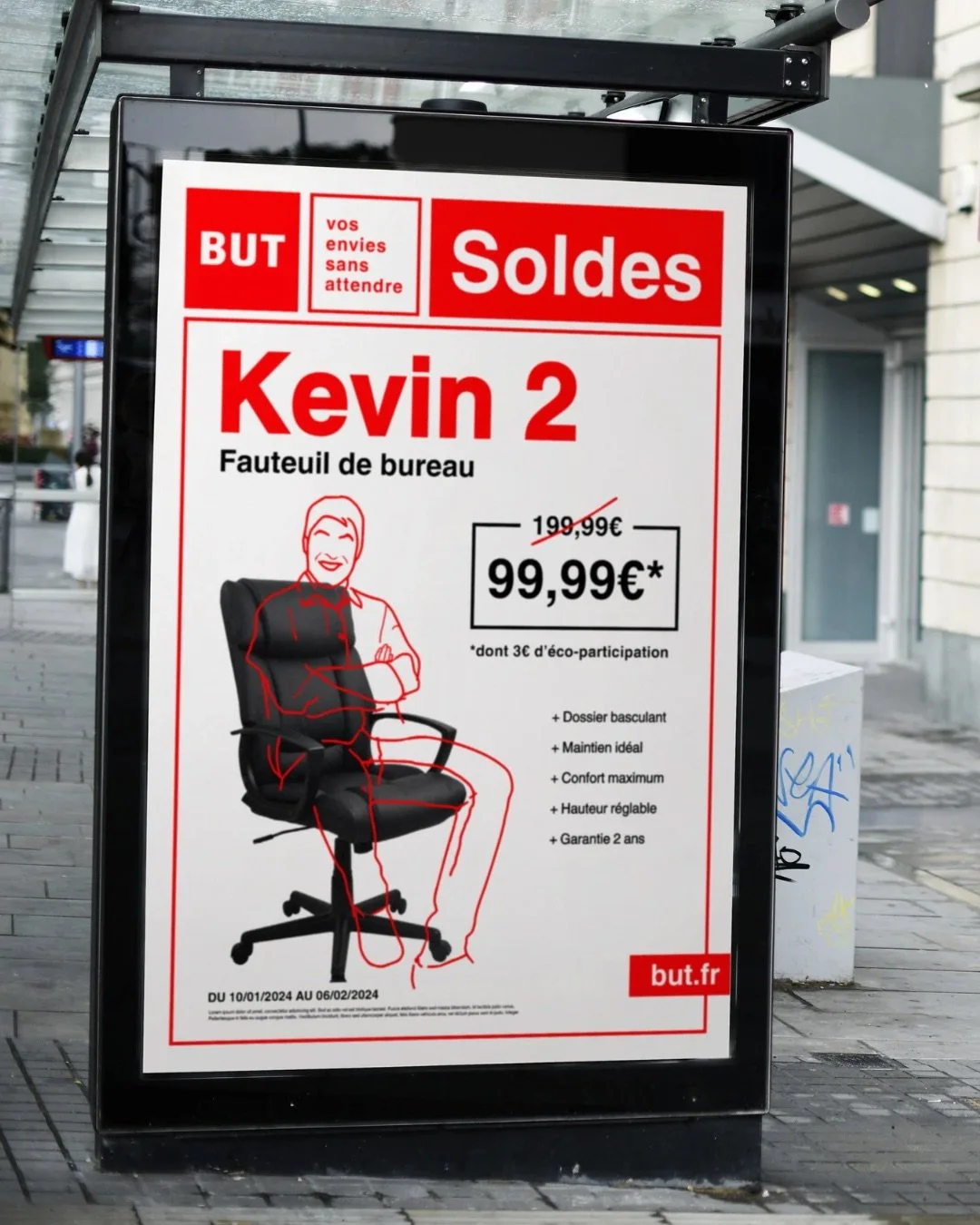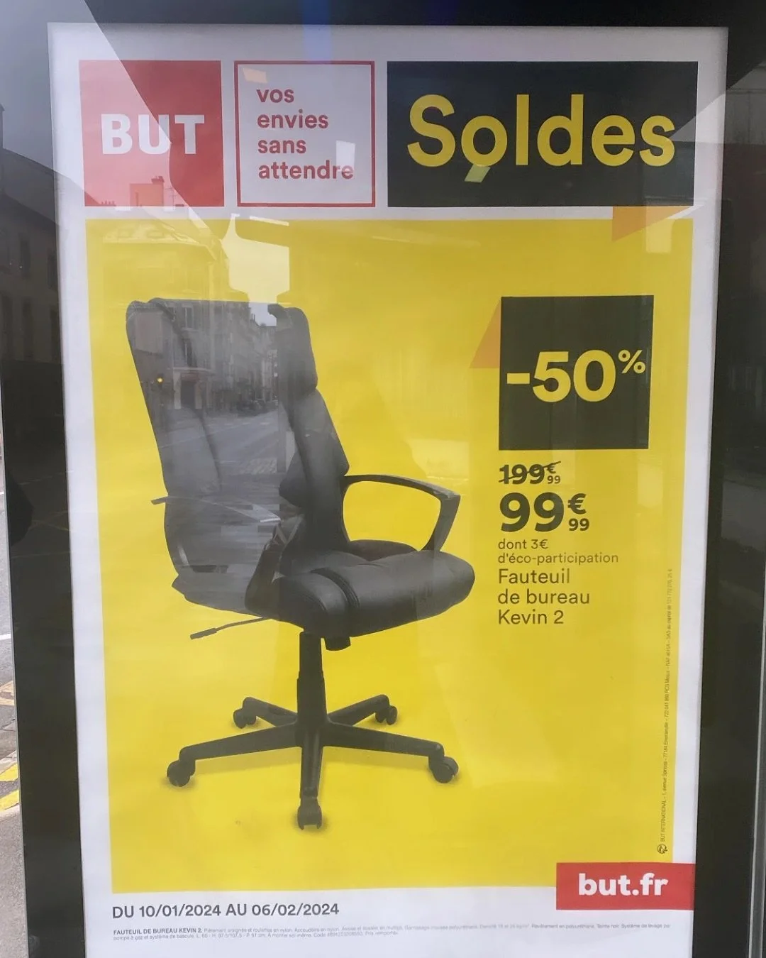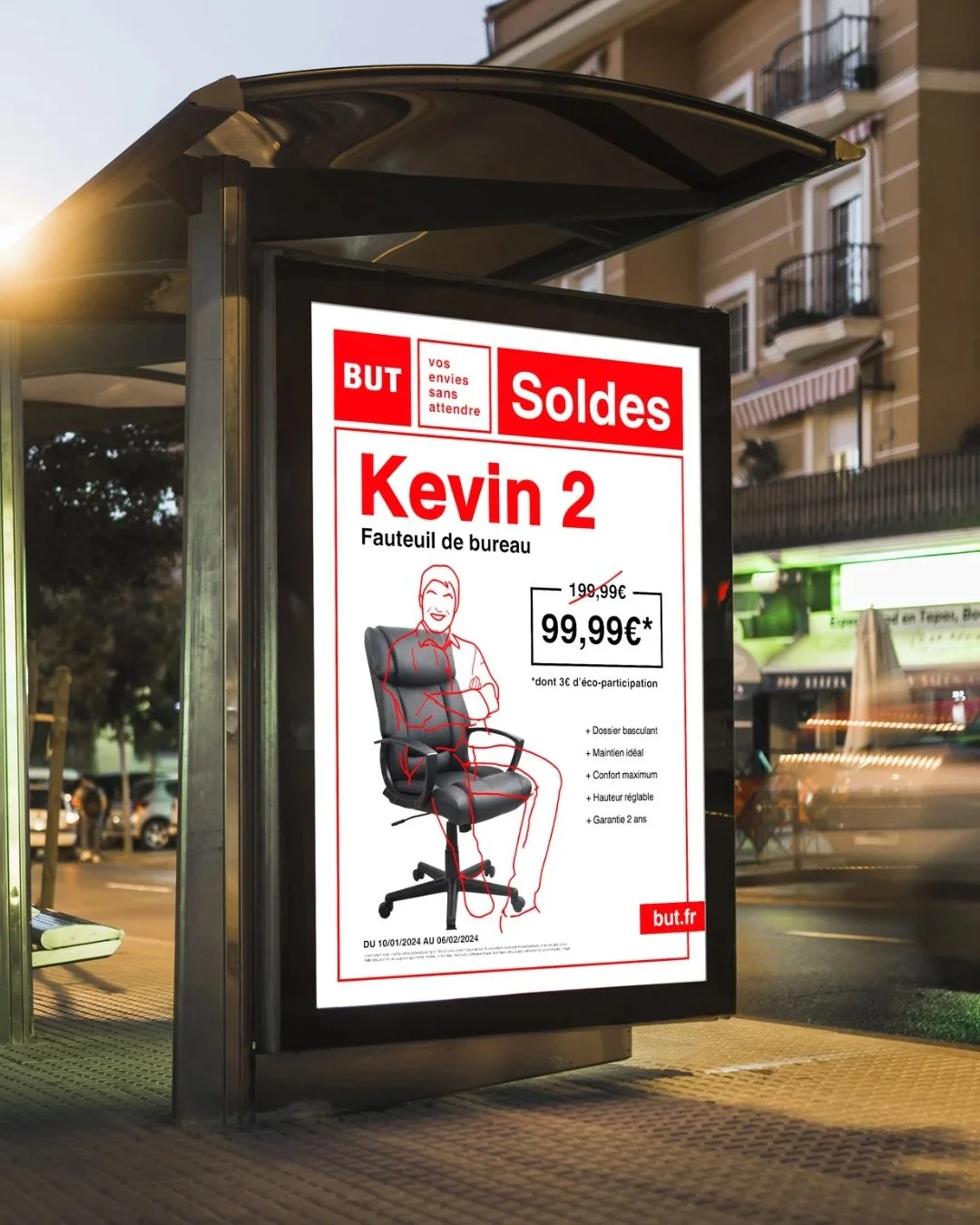 Le dimanche 21/01, en attendant mon bus, j’ai remarqué la présence d’une affiche de la marque de mobilier et décoration BUT destinée à promouvoir la réduction appliquée sur leur fauteuil « Kevin 2 ».
